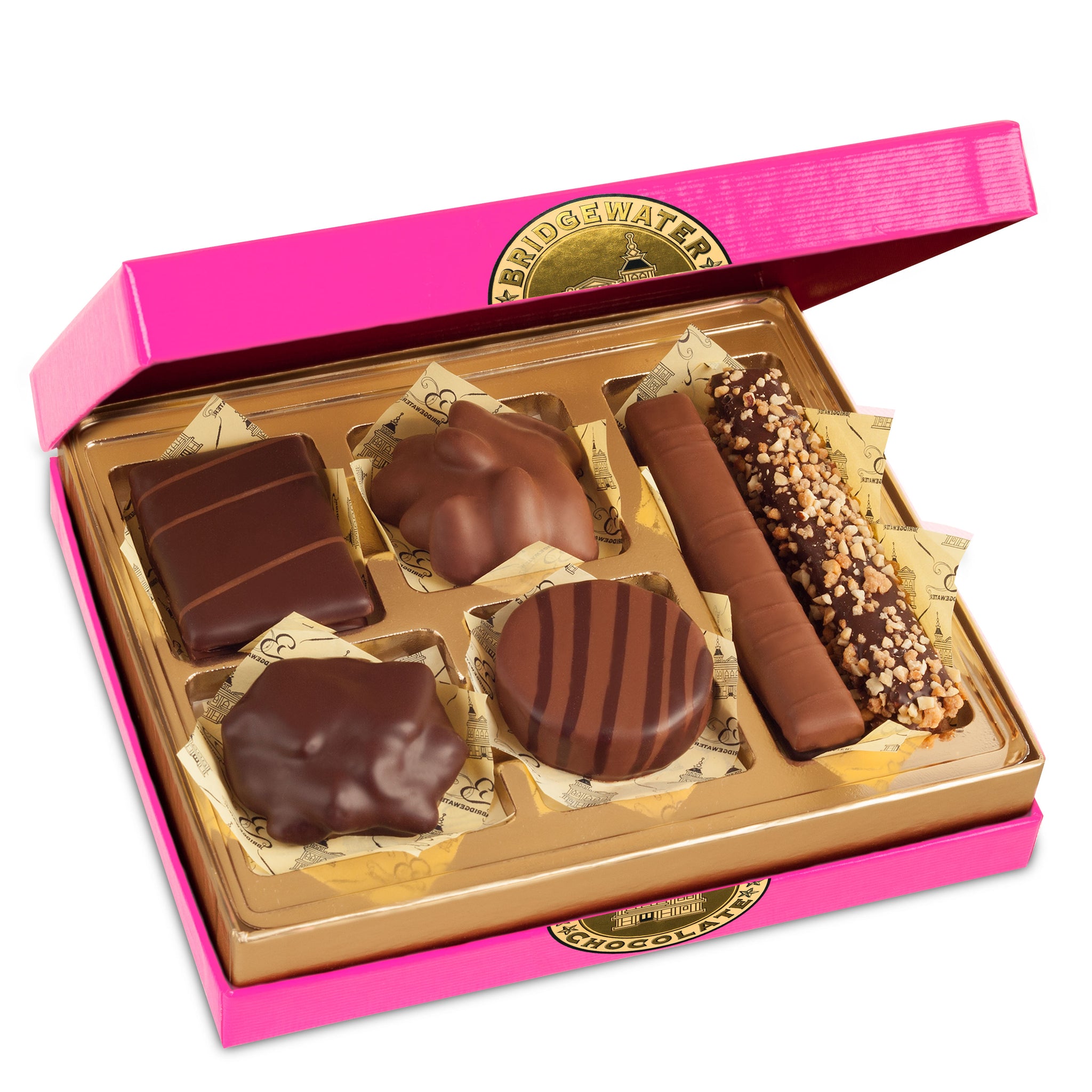 Our Pink Assortment boxes contains a variety of Caramels, Toffees, Törtéls (nuts and caramel), Solid Belgian Chocolate and Peanut Butter. All our confections are carefully dipped in our own blend of the finest milk and dark (68%) chocolate.